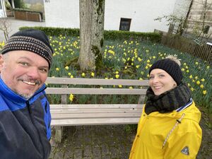 Verweilen oder auf dem Weg ein Päuschen einlegen – am schönsten ist dies im Freien auf Bänken unter schönen Bäumen. Die Bank in der Hochdorfer Straße unter dem Lindenbaum wurde im Auftrag des Vollmaringer Ortschaftsrates vom Team des Bauhofs unter der Leitung von Thomas Rechenberg erneuert. Die neue Bank wertet den Platz auf und lädt zum Verweilen ein. Der Platz mit den blühenden Narzissen ist inzwischen ein Schmuckstück in Vollmaringen. Ortschaftsrätin Kati Spohn und Ortsvorsteher Daniel Steinrode haben die Bank trotz Regen begutachtet und sind mit dem Ergebnis zufrieden.